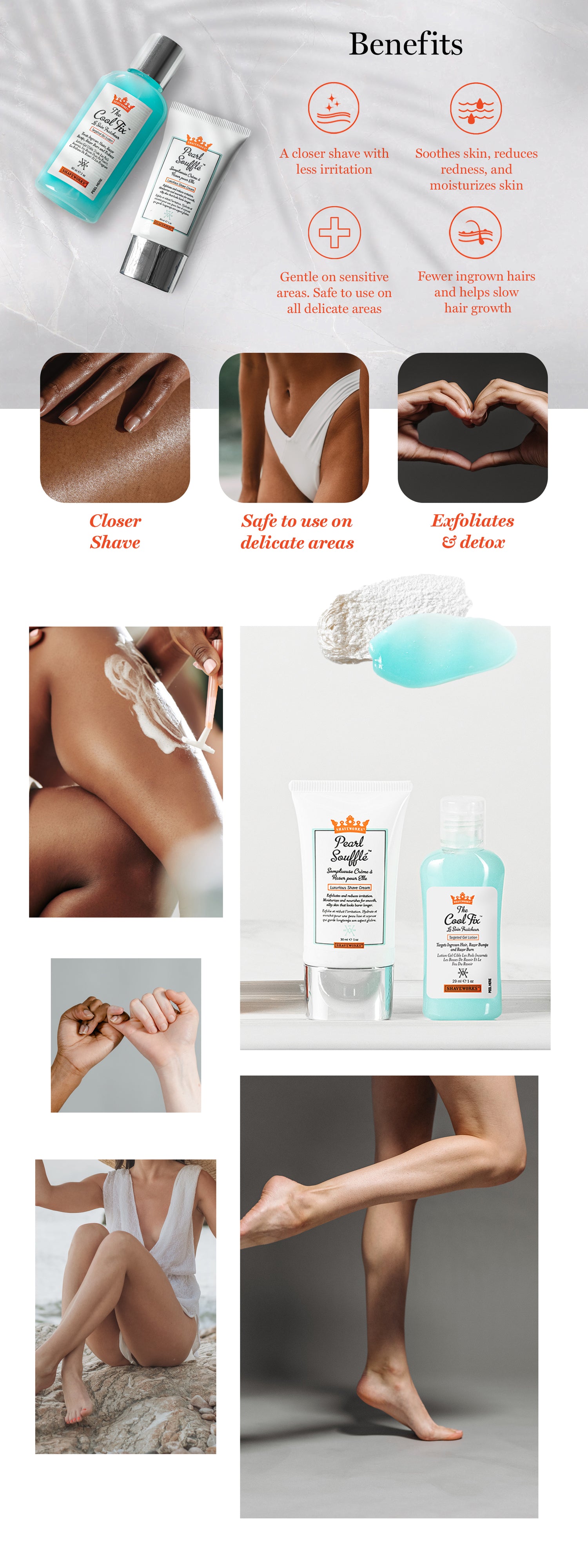 1. After cleansing and exfoliating the skin, apply an even thin layer of The Pearl Soufflé Shave Cream to legs, bikini, or underarms.